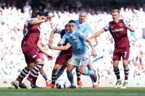 Now two down to Foden’s 27th goal of the campaign, the Hammers had everyone in sky blue encamped in their half as Manuel Akanji and De Bruyne both peppered the overworked, albeit agile, Areola into defiant stops while the curiously subdued Erling Haaland then failed to convert from just a couple of yards when it surely would have been far easier to score.