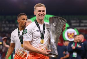 Flynn Downes of West Ham United celebrates with the UEFA Europa Conference League trophy after the team’s victory during the UEFA Europa Conference