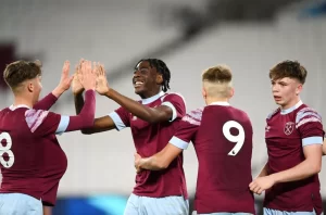 LONDON, ENGLAND – APRIL 06: Divin Mubama of West Ham celebrates with teammates after scoring his sides 5th goal during the FA Youth Cup Semi-Final match between West Ham United U18 and Southampton U18 at London Stadium on April 06, 2023 in London, England.